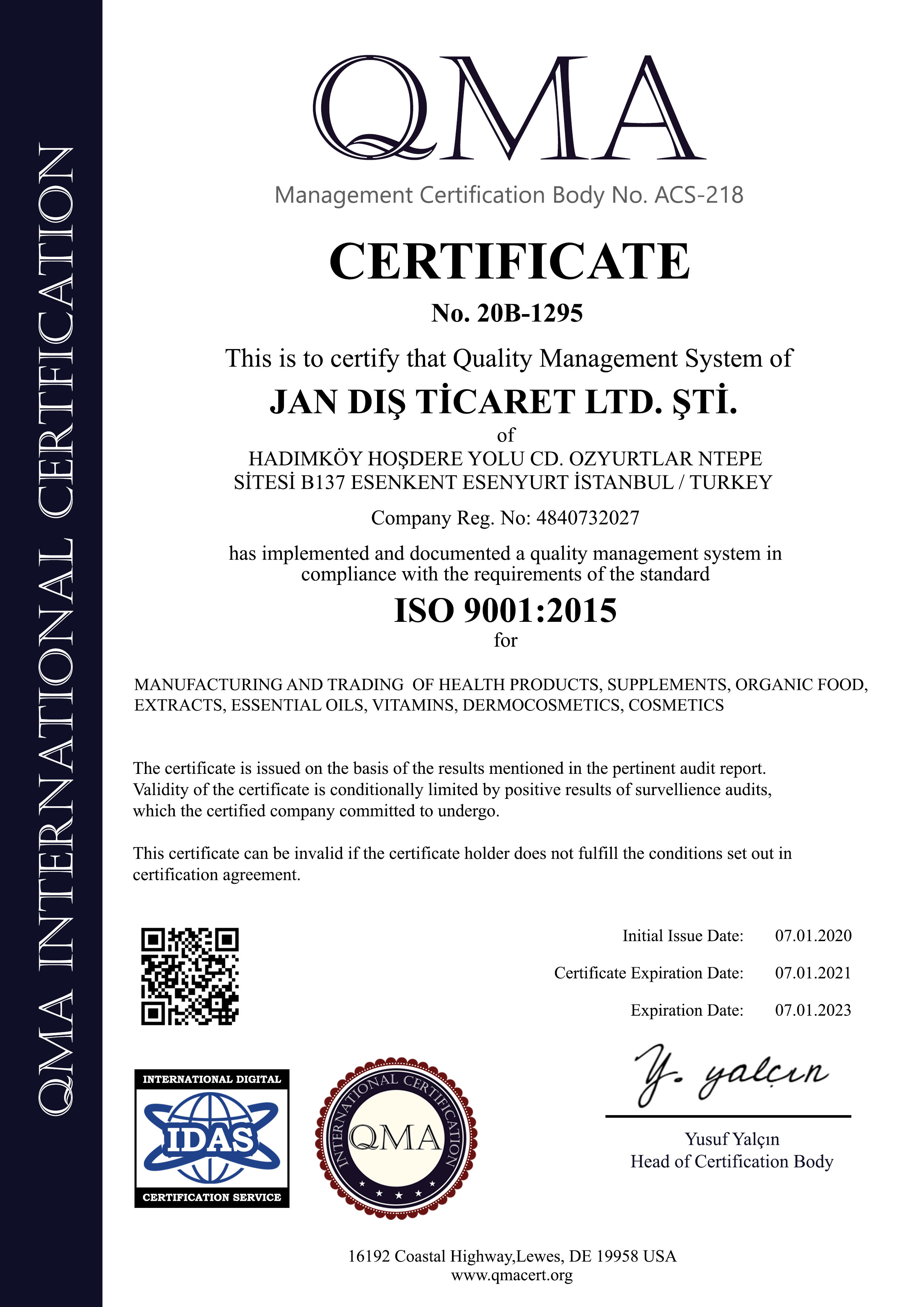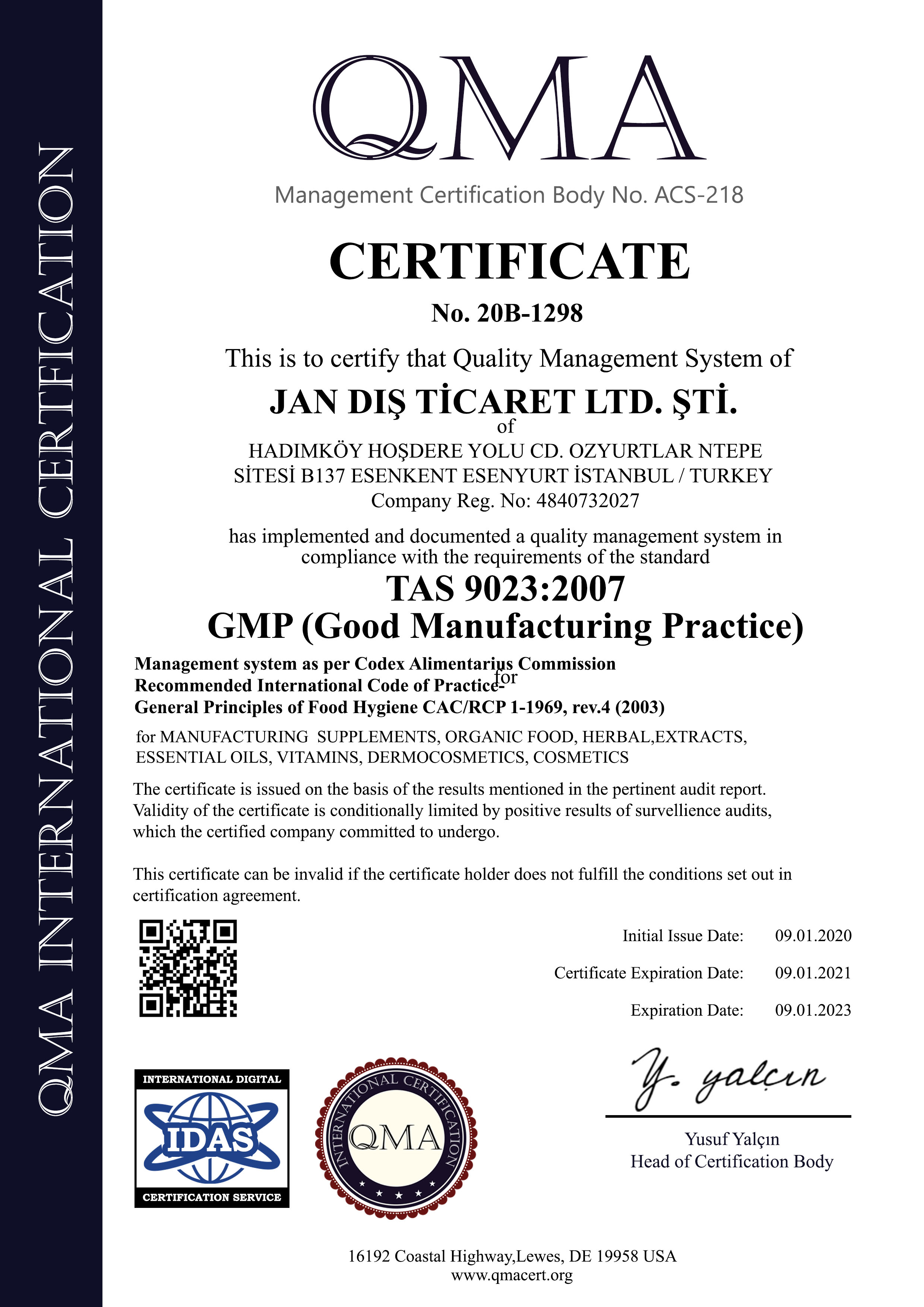 The Management System is certified ISO 9001:2015 , ISO 14001:2015 and OHSAS 18001:3007 by “IDAS” for the conception, production and sale. All Jan Health products are compliant with the Good Manufacturing Practices (GMP).
